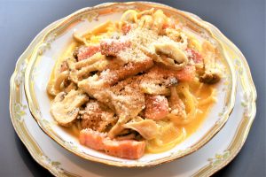 - お好みで粉チーズとブラックペッパーを振って完成。