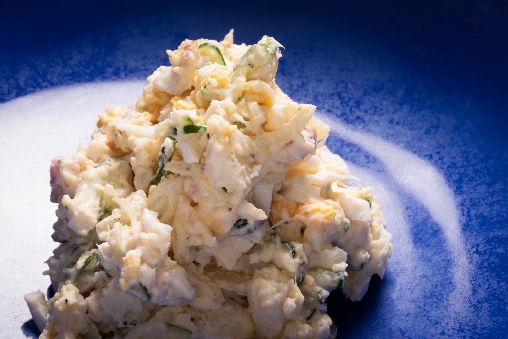 - ボウルにゆでたじゃが芋、ベーコンを加え、きゅうり・玉葱・ゆで卵をざっくりと混ぜ合わせ、仕上げにマヨネーズと黒こしょうを加えて味を調えます。